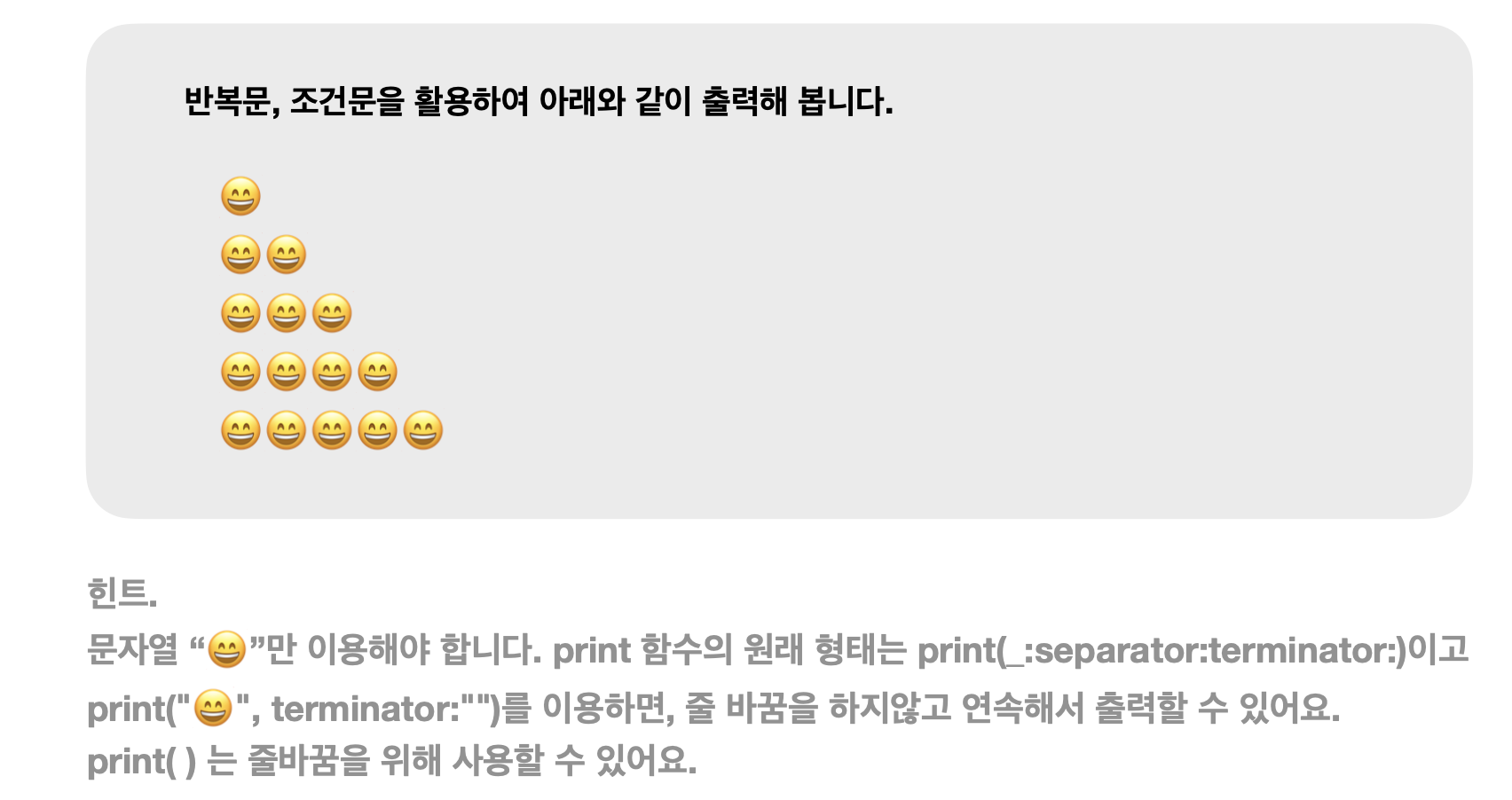 목차 반응형 19 반복문 활용, 논리를 구성하여 출력해보기 문제 풀이 import UIKit for i in 1...5{ for j in 1...5{ if j <= i{ print("😄", terminator: "") } } print() } 반응형 공유하기 게시글 관리 YANGKONG TECH 저작자표시 비영리 (새창열림) 목차 목차 닫기