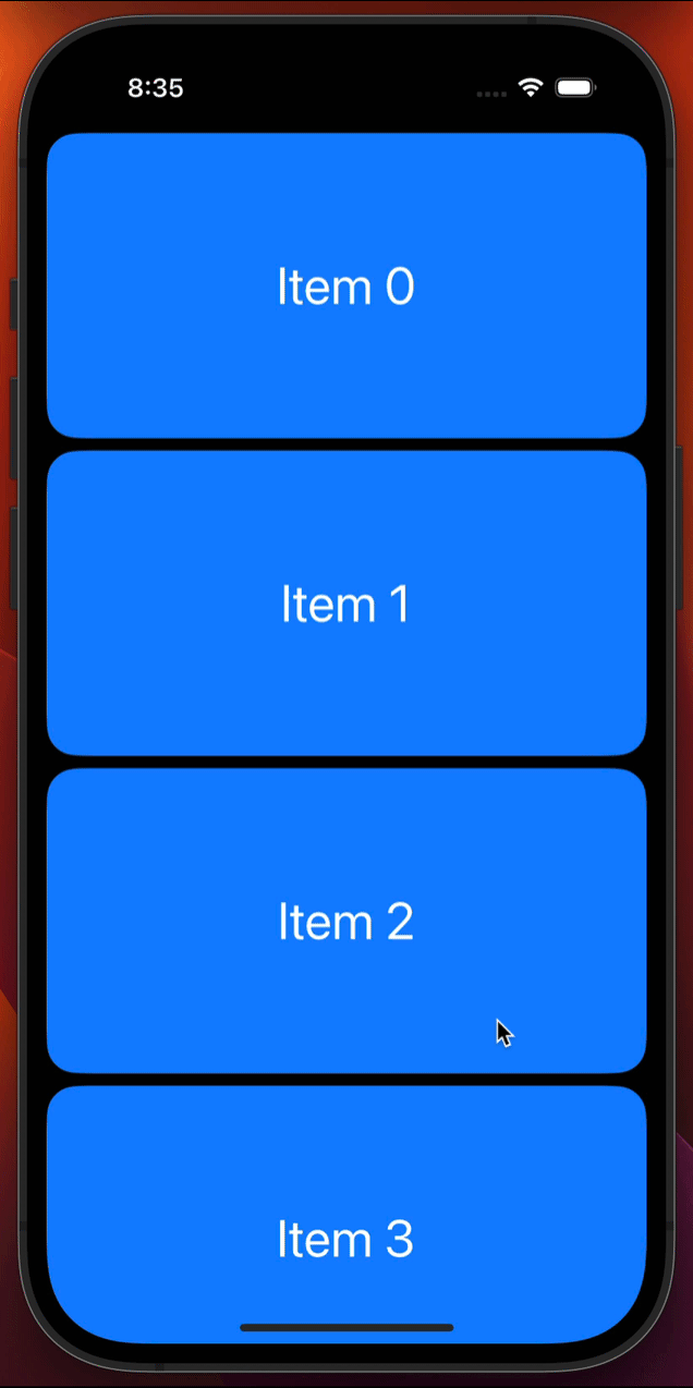 .scrollTargetBehavior()๊ฐ .viewAligned๋ก ์ค์ ๋์ด ์๊ธฐ ๋๋ฌธ์ SwiftUI๋ ๋ฅ๊ทผ ์ฌ๊ฐํ ๊ฐ์ ์๋์ผ๋ก ์ค๋ ๋ฉ๋๋ค.